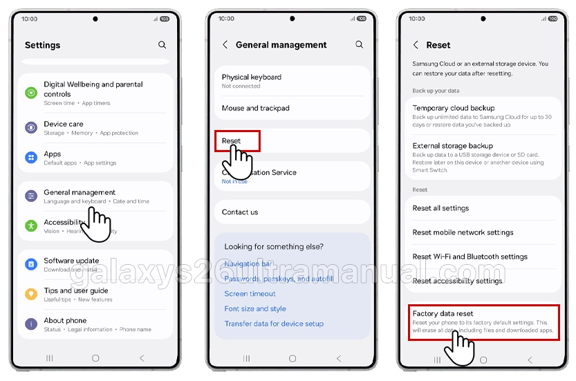 A factory reset (also called a hard reset) erases all data, settings, and apps from your Galaxy S26 Ultra, returning it to the same state as when you first unboxed it.