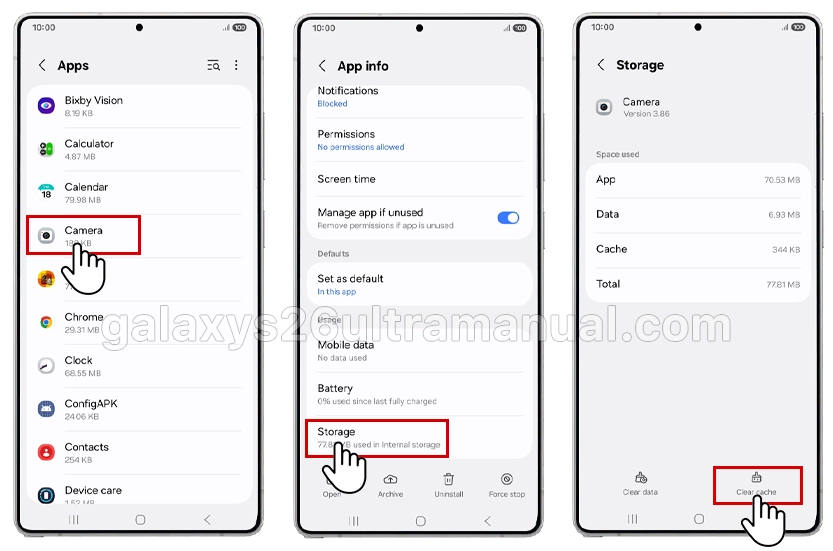 Clearing the cache removes temporary files causing glitches, while clearing data resets the app to default settings. This step resolves most camera-related problems on the Galaxy S26 Ultra.