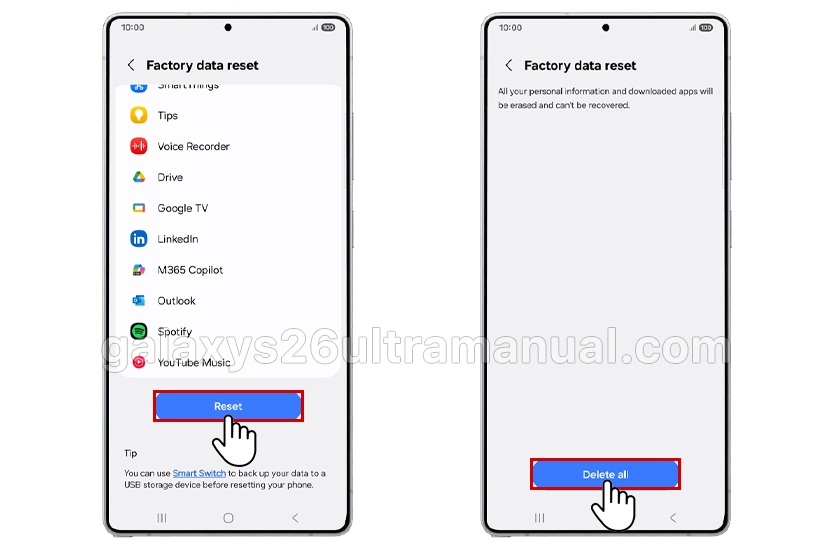 This restores your Galaxy S26 Ultra to original factory settings, removing all apps, accounts, and personal data. Use only when other solutions fail.